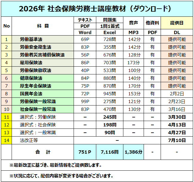 合格できる人とできない人の差は、触れた問題数の差です。過去出題の問題は同じものが2つとありません。 同じテーマを異なる角度から切り込んで出題しています。 ですので、多くの問題パターンに触れる機会を殖やすことで、この試験特有の性質やクセを読み取っていくことが大事なのです。 弊社では約20日間隔で各法律教材を配信しますが、この配信ペースに学習スピードをあわせることが合格の秘訣です。 毎日の学習はもちろんのこと、遅れた分は休みを使って一気に消化しましょう。理解できない個所は後から見直せるようチェックし、先に進んで下さい。 合格するには、試験に出題される必要な知識や情報を覚えることの他に、覚えた内容を記憶し続けることが大事です。 ですが、・・・ 単に知識を覚えただけでは合格はできません!!合格にはセンスが必要です。センスというのは「感覚」「勘」「判断力」のこと。 問題を読んだ時に何を求められているのか瞬時に読み解く力です。同じ食材とレシピを与えても、美味しく調理できる人とできない人がいます。 同じ知識や情報を暗記しても、試験で上手に問題を処理できる人と下手な人がいます。ほとんどの人が、普段の学習で、食材(知識)とレシピ(テキスト)を眺めているだけで、調理(問題を解く)することを怠っています。 何度も実際に調理してみて、ダメなところを修正する努力を積み重ねて、センスは次第に磨かれていきます。 ですので、「8月までに知識を吸収できれば良い」と考え、学習計画を立てている人は、8月までに食材とレシピを準備しているだけの人です。 料理を作ったこともない人(=問題を解くコツを身に着けていない人)が、本番試験でいきなり上手な料理をつくって、全体の上位5%〜6%(R7年試験の合格率は5.5%)に入れると思いますか? 合格したいなら3月末までが勝負です。それまでに「基本知識」を身に着けてください!! 4月以後はセンスを徹底的にセンスを磨く時期です。競争試験に勝つは、戦略と計画が必要です。 法改正・統計・白書をはじめ、様々な政府関連資料に目を通すのも4月以後となりますので、この時期にまだ基礎知識の習得に励んでいるようだと、試験に間に合わなくなる危険が高くなります。 ライバルと同じレベルの情報量では勝てませんので、弊社教材の配信ペースと学習スピードはできる限り一致させることが、合格の秘訣(コツ)です。 弊社では問題の解き方、注目すべきポイント、正誤判断根拠などを必要に応じて、追加資料等(無料)もお渡し、丁寧に解説致します。 また、電子教材ですので条文サイトや厚労省等のホームページとリンクさせて使うこともできます。短期間で効率よく理解できる学習テクニック満載の教材です。 他社教材では不可能な機能が数多くあります。アレンジは自由自在。社会保険労務士試験合格に必要な資料は、すべてご提供致します。 さあ、2026年(令和8年)は、あなたが、社会保険労務士になる年です!! ※ご注文&ご興味ある方はこちらから→ |